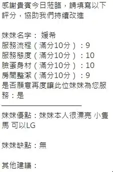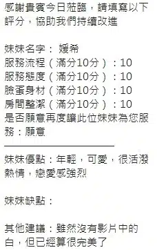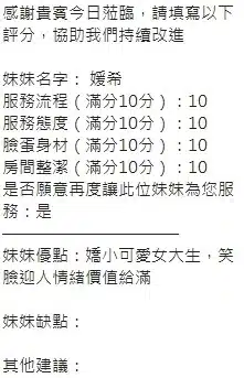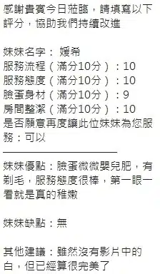 奶砲,按摩,69,共浴,LG(舌吻)依氣氛衛生而定,可親嘴,無套吹,品鮑,舔蛋,奶推,屁推,水床浴,變裝(自備免付),絲襪(自備免付),快餐,2S