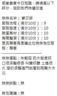 奶砲,按摩,69,共浴,LG(舌吻)依氣氛衛生而定,可親嘴,無套吹,口爆,品鮑,舔蛋,奶推,屁推,顏射,水床浴,變裝(自備免付),絲襪(自備免付),中文溝通,快餐,2S
