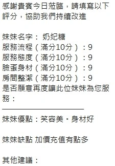 奶砲,按摩,69,共浴,泰國浴,LG(舌吻)依氣氛衛生而定,可親嘴,無套吹,口爆,品鮑,舔蛋,奶推,屁推,水床浴,變裝(自備免付),絲襪(自備免付),快餐,2S,包夜