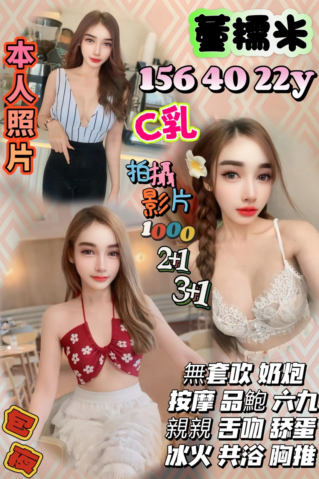 奶砲,按摩,69,共浴,LG(舌吻)依氣氛衛生而定,可親嘴,無套吹,品鮑,奶推,屁推,冰火,絲襪,攝影,快餐,2S