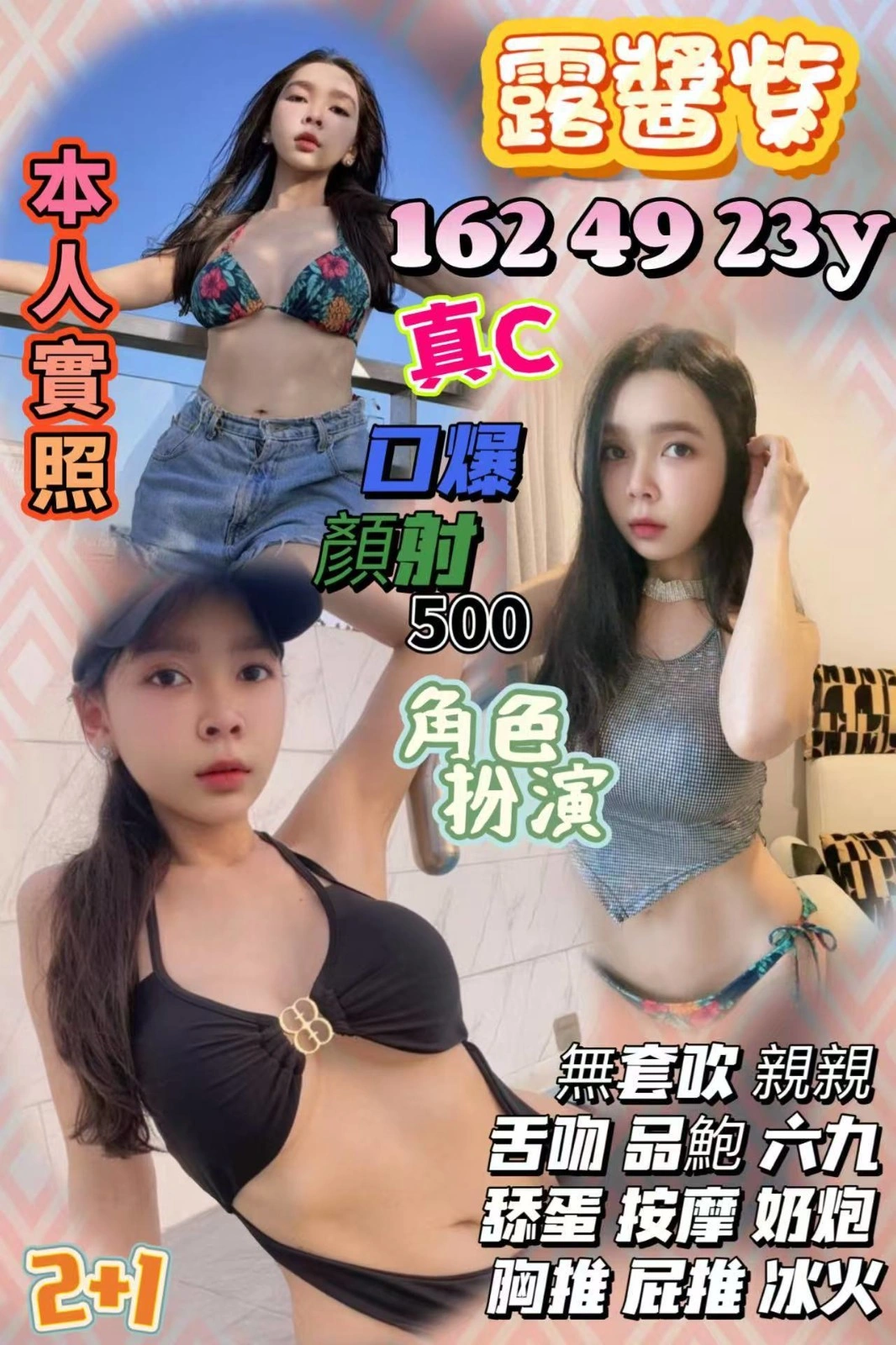 奶砲,按摩,69,LG(舌吻)依氣氛衛生而定,可親嘴,無套吹,品鮑,舔蛋,奶推,屁推,冰火,顏射,變裝(自備免付),快餐,2S