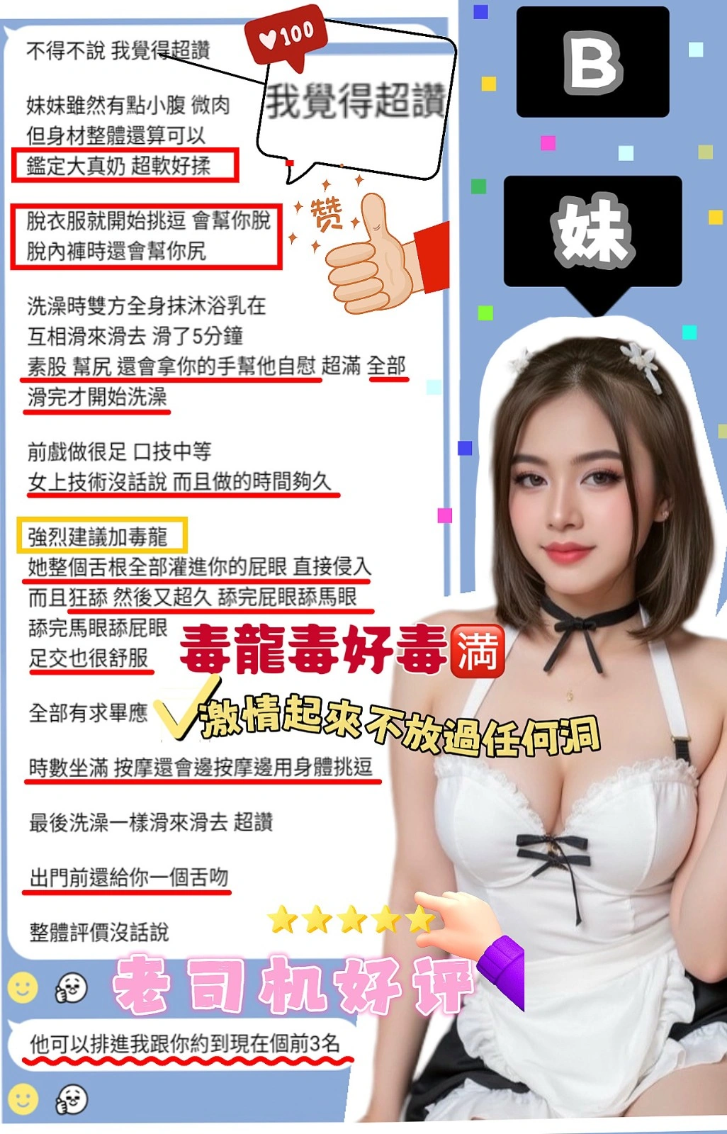 毒龍,按摩,69,共浴,LG(舌吻)依氣氛衛生而定,可親嘴,無套吹,口爆,足交,品鮑,舔蛋,奶推,屁推,顏射,浴中蕭,絲襪,無套做,自慰秀,攝影,快餐,2S,NS