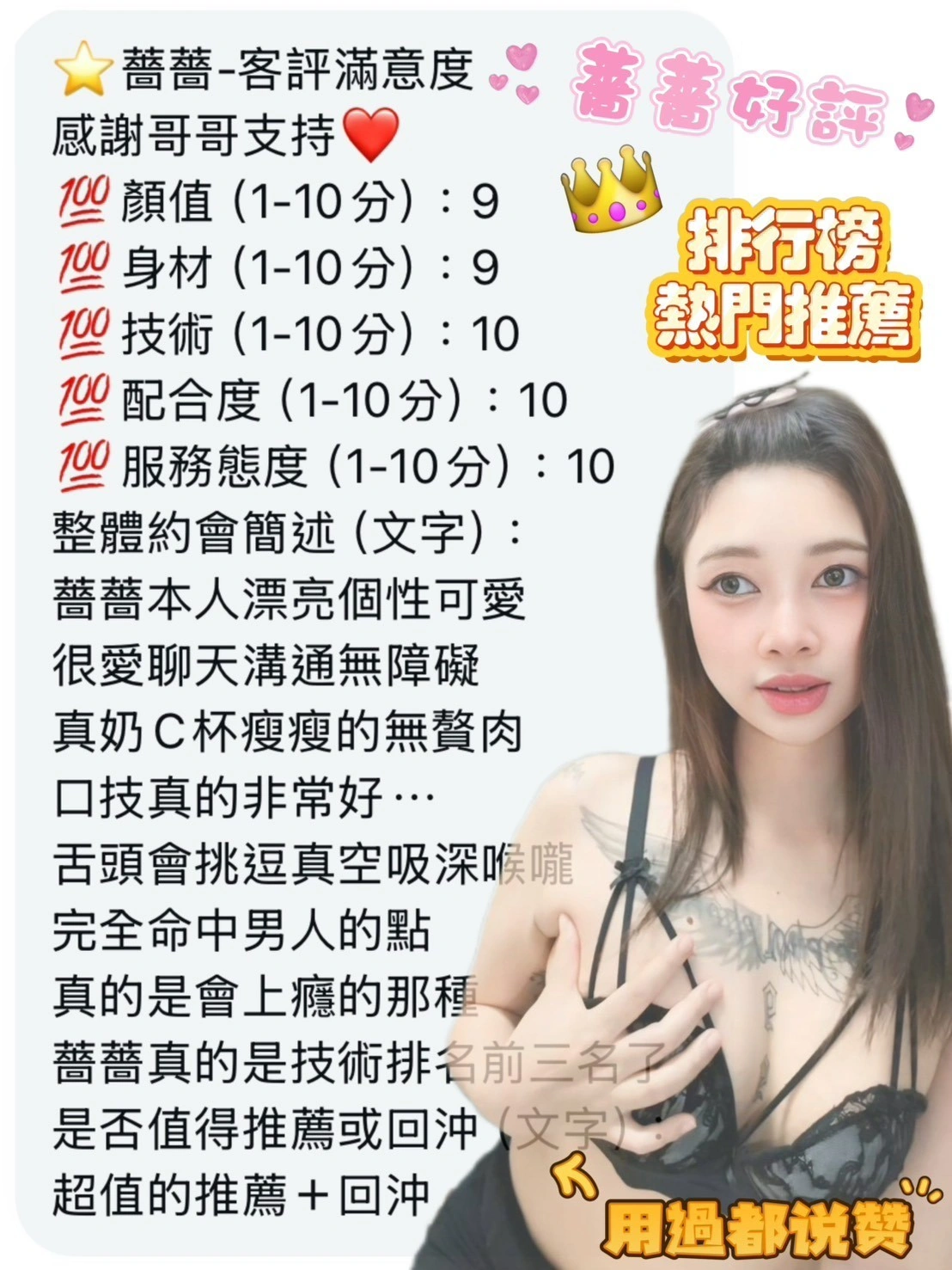 按摩,69,共浴,LG(舌吻)依氣氛衛生而定,可親嘴,無套吹,口爆,品鮑,顏射,變裝(自備免付),絲襪,快餐,2S