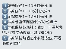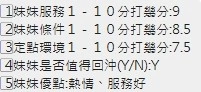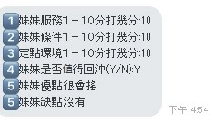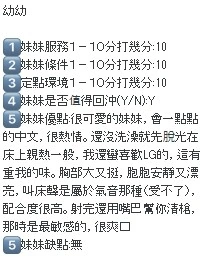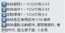 奶砲,按摩,69,共浴,LG(舌吻)依氣氛衛生而定,可親嘴,無套吹,口爆,品鮑,舔蛋,奶推,屁推,顏射,水床浴,變裝(自備免付),絲襪(自備免付),無套做,無套內射,中文溝通,快餐,2S