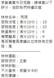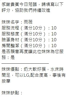 奶砲,按摩,69,共浴,LG(舌吻)依氣氛衛生而定,可親嘴,無套吹,口爆,品鮑,舔蛋,奶推,屁推,顏射,水床浴,變裝(自備免付),絲襪(自備免付),快餐,2S
