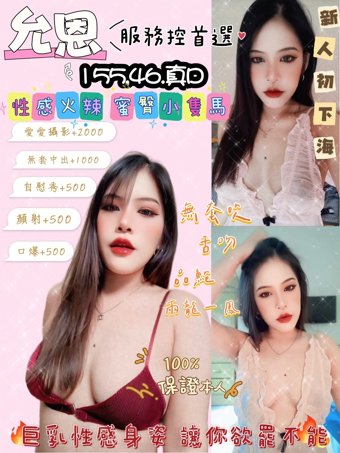 2S+500(60分),口爆+500,顏射+500,自慰秀+500,情趣用品+500,無套外射+1000,無套內射+1500,攝影+1000(不露臉),攝影+2000(露臉)