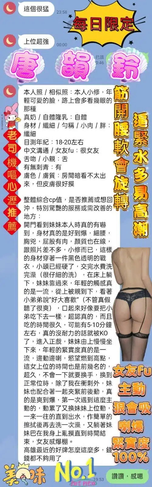 奶砲,按摩,69,殘廢澡,LG(舌吻)依氣氛衛生而定,可親嘴,無套吹,舔蛋,漫遊,奶推,冰火,深喉嚨,絲襪(自備免付),自慰秀,白人,中文溝通,快餐,2S,包夜