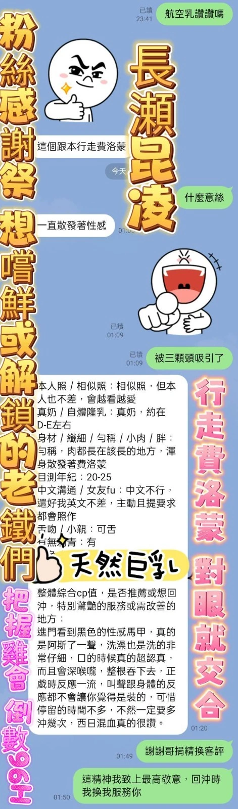 奶砲,按摩,69,殘廢澡,LG(舌吻)依氣氛衛生而定,可親嘴,無套吹,口爆,品鮑,舔蛋,漫遊,奶推,冰火,深喉嚨,絲襪(自備免付),無套做,快餐,2S,包夜