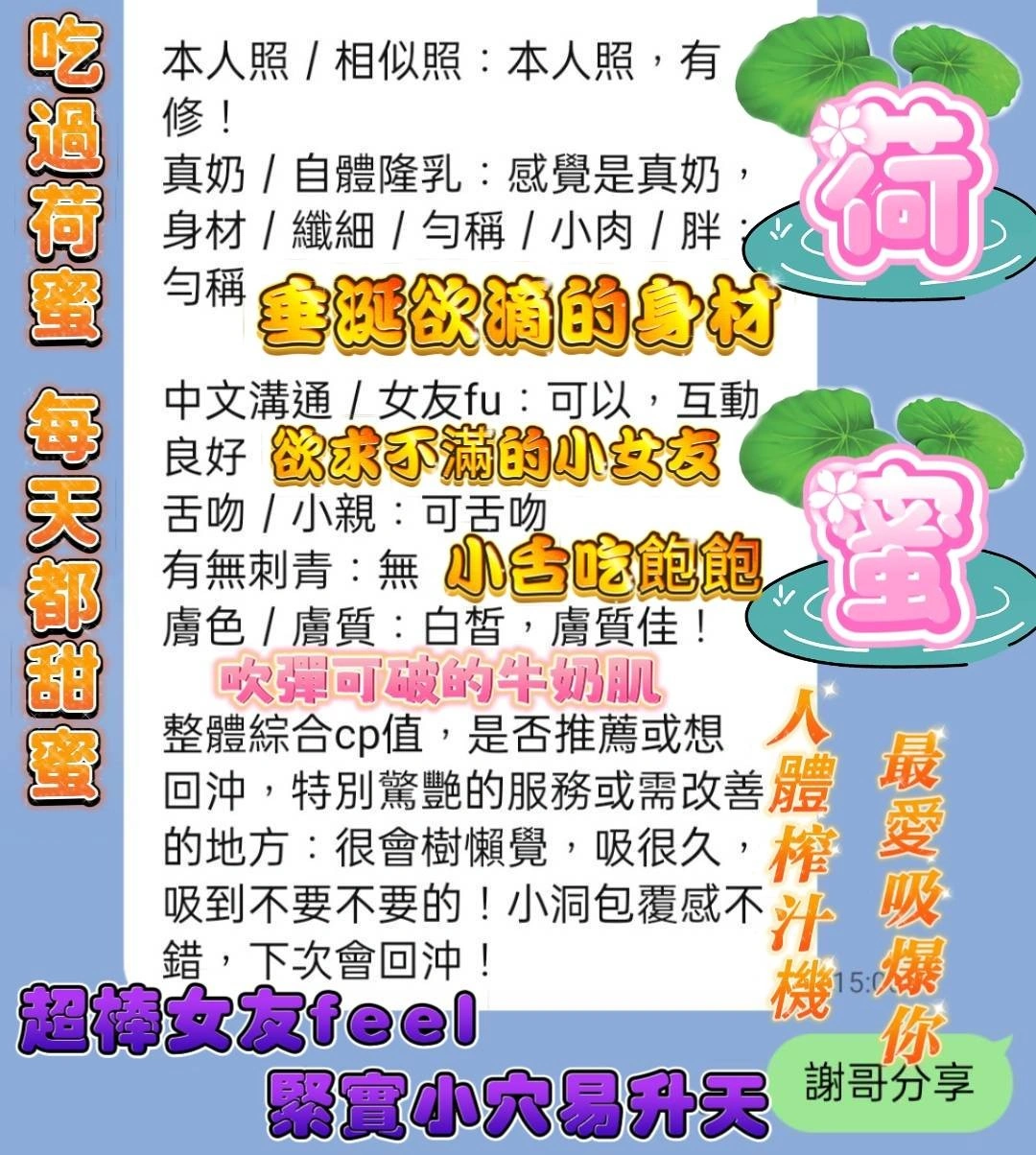 奶砲,按摩,69,殘廢澡,LG(舌吻)依氣氛衛生而定,可親嘴,無套吹,口爆,舔蛋,漫遊,奶推,冰火,顏射,深喉嚨,絲襪(自備免付),自慰秀,攝影,中文溝通,快餐,2S