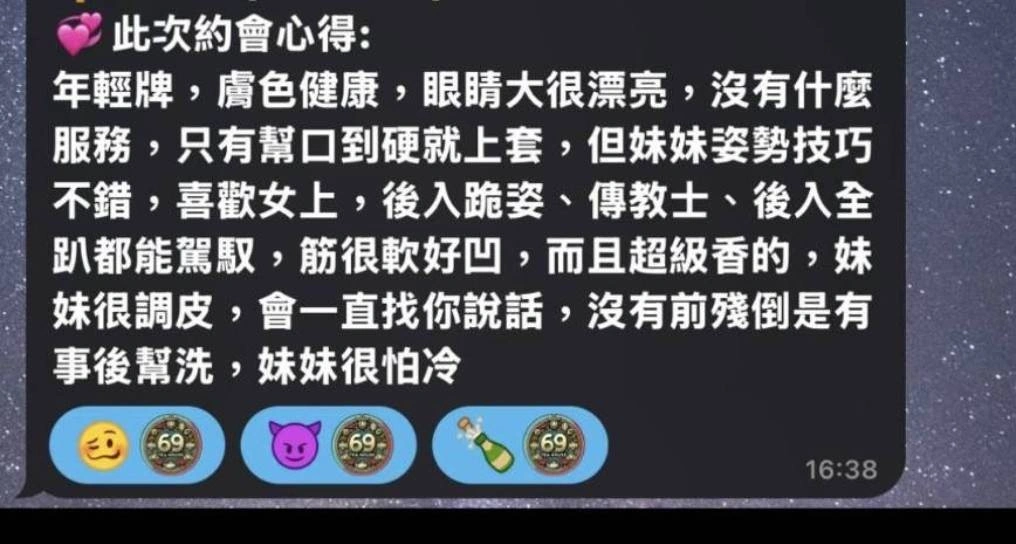 按摩,69,LG(舌吻)依氣氛衛生而定,可親嘴,無套吹,品鮑,奶推,屁推,快餐,2S