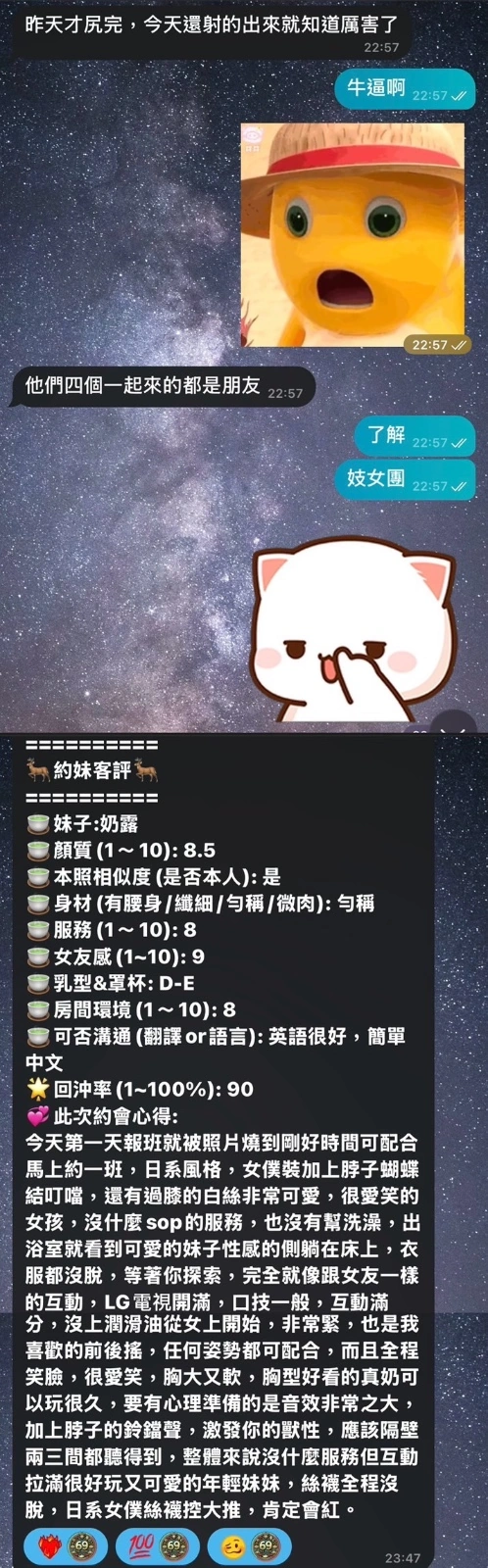 奶砲,按摩,69,共浴,殘廢澡,LG(舌吻)依氣氛衛生而定,可親嘴,無套吹,品鮑,舔蛋,輕功,顏射,快餐,2S
