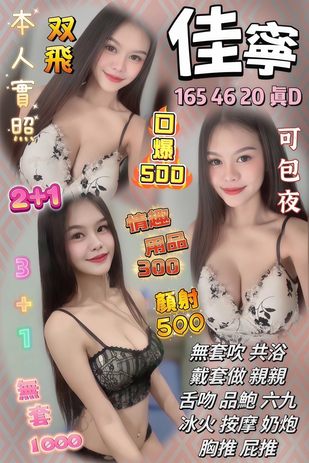 2S+500(60分),口爆+500,顏射+500,無套外射+1000,情趣用品+300