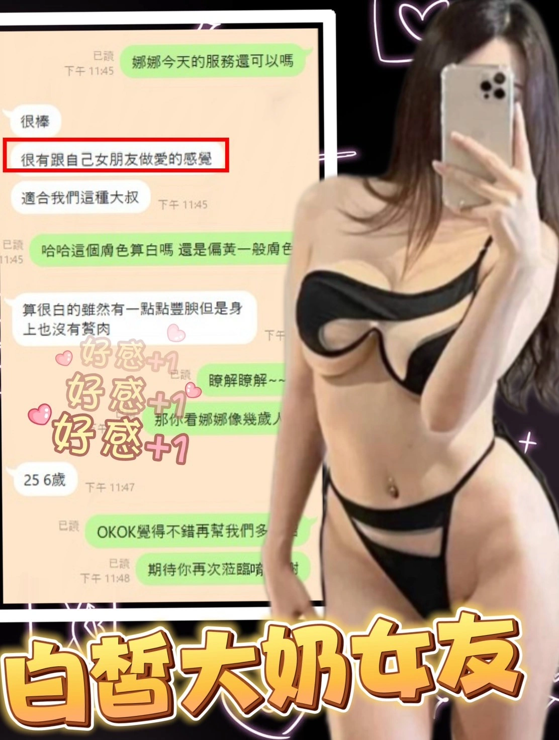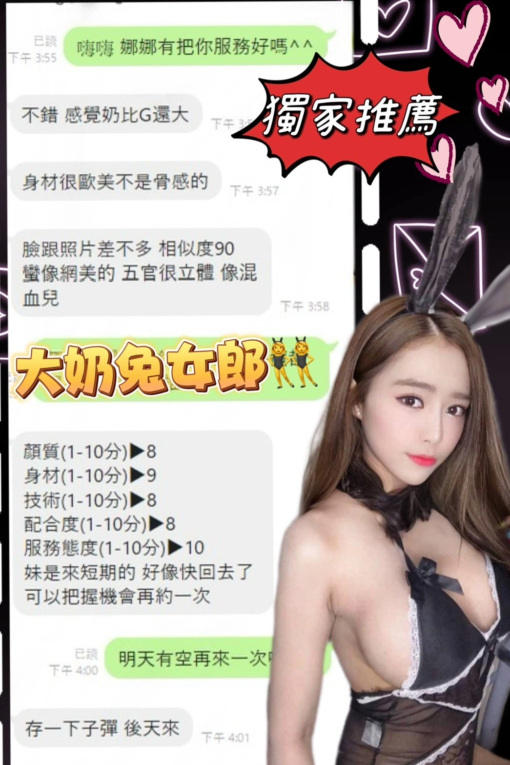 奶砲,按摩,69,共浴,泰國浴,LG(舌吻)依氣氛衛生而定,可親嘴,無套吹,品鮑,舔蛋,奶推,屁推,冰火,顏射,絲襪(自備免付),快餐,2S