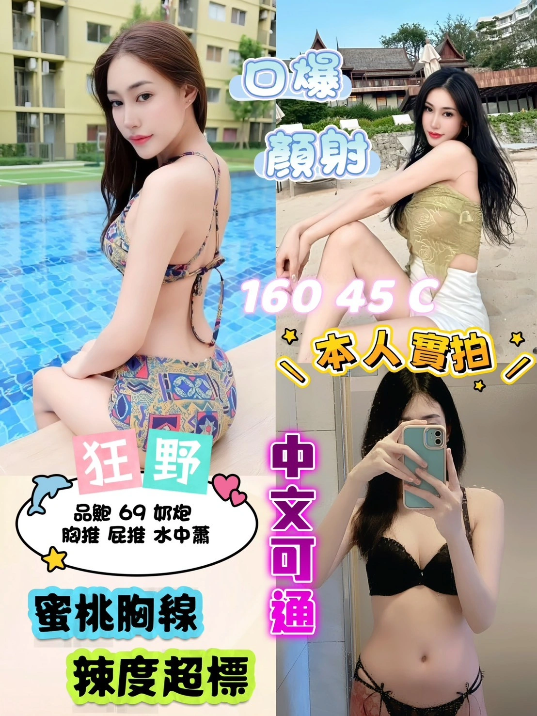奶砲,按摩,69,殘廢澡,無套吹,口爆,品鮑,舔蛋,奶推,屁推,顏射,浴中蕭,中文溝通,快餐,2S