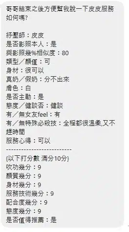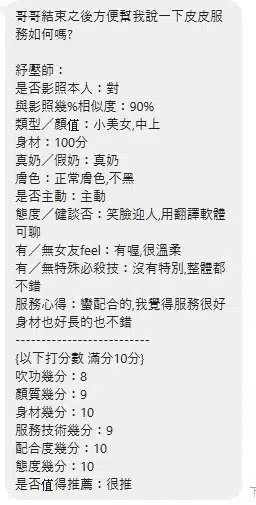 奶砲,按摩,69,殘廢澡,LG(舌吻)依氣氛衛生而定,可親嘴,無套吹,口爆,足交,品鮑,奶推,屁推,顏射,浴中蕭,深喉嚨,變裝(自備免付),絲襪(自備免付),自慰秀,攝影,快餐,2S