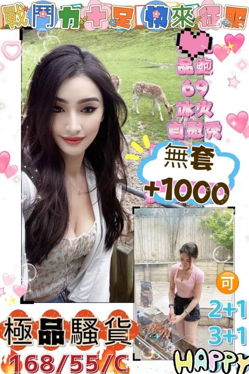 2S+500(60分),無套外射+1000,自慰秀+500,情趣用品+500(客自備),口爆+500,顏射+500,絲襪+100,0.01套+100