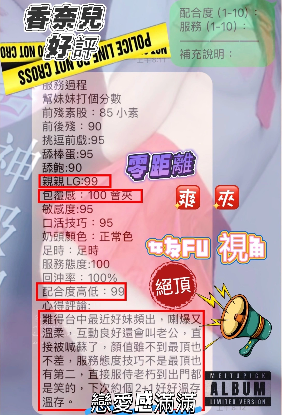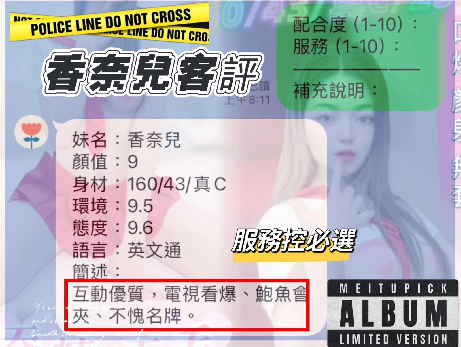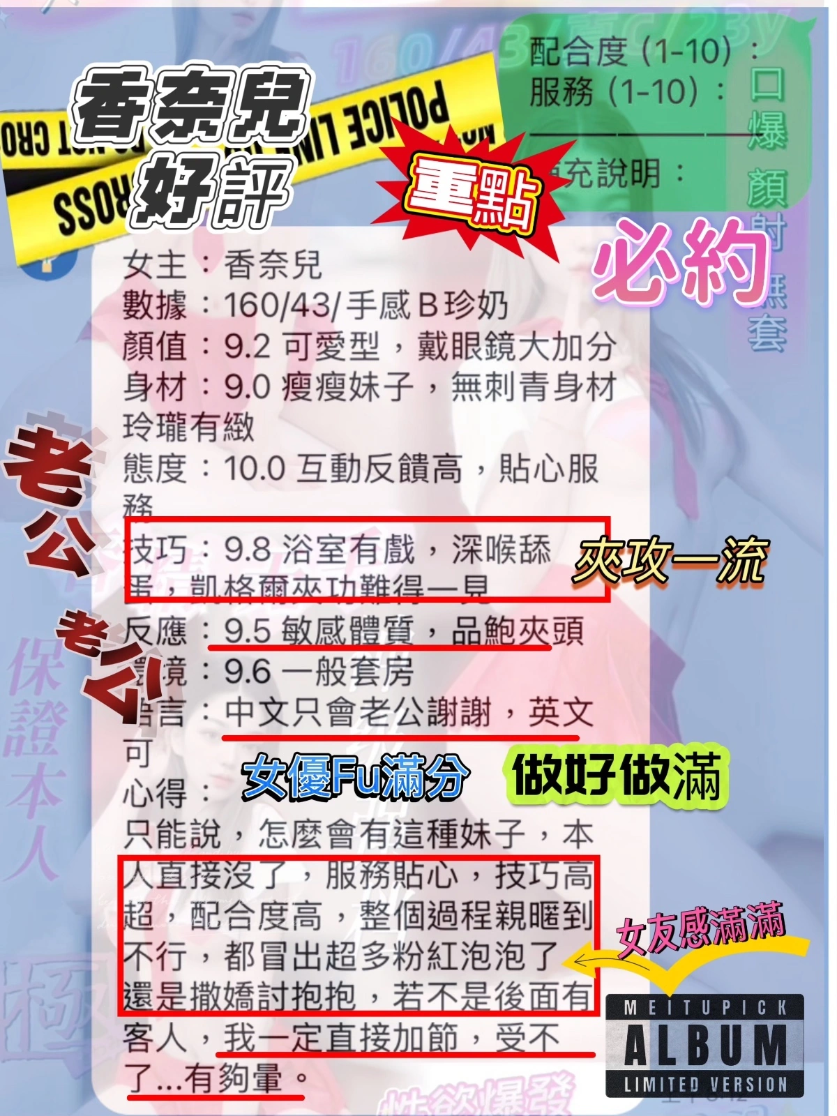 毒龍,69,共浴,LG(舌吻)依氣氛衛生而定,可親嘴,無套吹,口爆,吞精,品鮑,舔蛋,奶推,屁推,顏射,水床浴,浴中蕭,深喉嚨,變裝,變裝(自備免付),絲襪,絲襪(自備免付),玩具(按摩棒),玩具(跳蛋),情趣用品(客自備),無套做,無套內射,後門,自慰秀,中文溝通,英文溝通,快餐,2S,NS,包夜,射後清槍