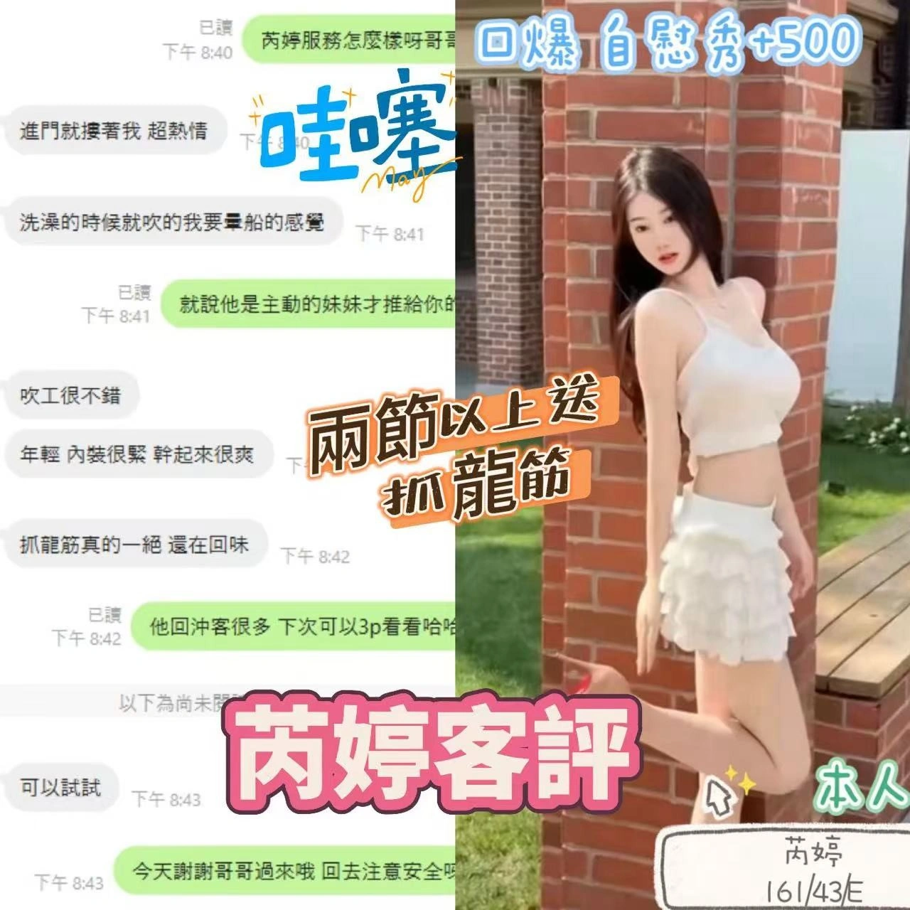 奶砲,按摩,69,殘廢澡,LG(舌吻)依氣氛衛生而定,可親嘴,無套吹,口爆,品鮑,舔蛋,漫遊,奶推,浴中蕭,絲襪,自慰秀,2S,包夜