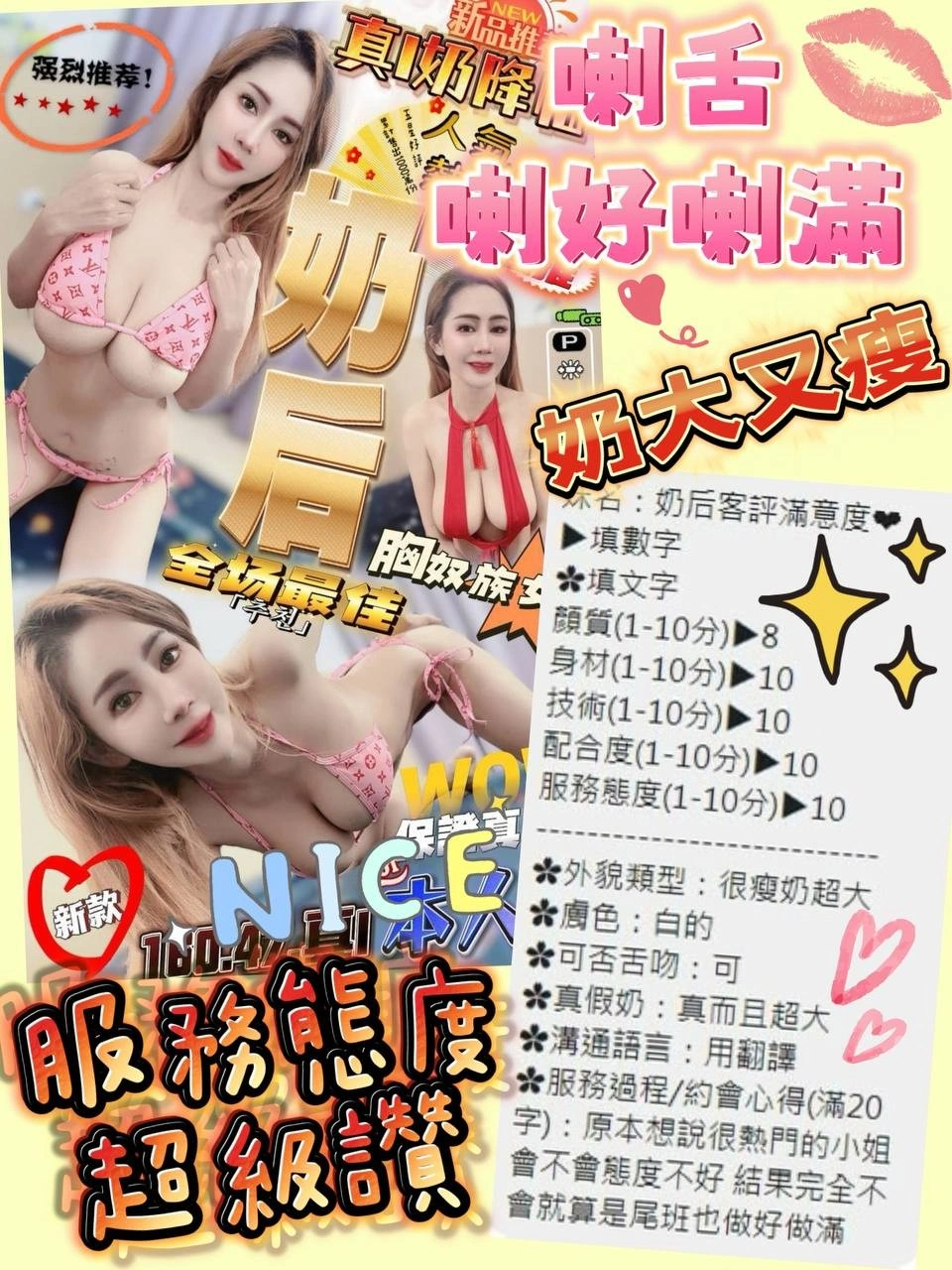 奶砲,按摩,69,共浴,殘廢澡,泰國浴,LG(舌吻)依氣氛衛生而定,可親嘴,無套吹,口爆,足交,品鮑,舔蛋,奶推,屁推,浴中蕭,深喉嚨,變裝(自備免付),絲襪(自備免付),玩具(按摩棒),玩具(跳蛋),情趣用品(客自備),自慰秀,英文溝通,快餐,2S,NS,包夜