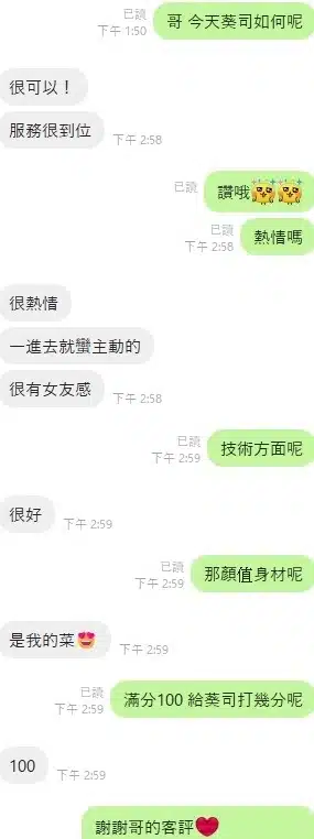奶砲,裸舌毒龍,按摩,69,陪洗,共浴,殘廢澡,LG(舌吻)依氣氛衛生而定,可親嘴,無套吹,口爆,品鮑,舔蛋,奶推,屁推,顏射,浴中蕭,深喉嚨,變裝(自備免付),絲襪(自備免付),玩具(按摩棒),玩具(跳蛋),情趣用品(客自備),無套做,無套內射,自慰秀,攝影,英文溝通,快餐,2S