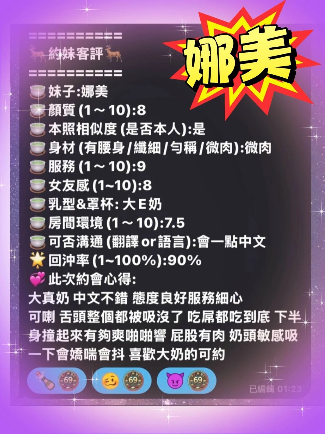 奶砲,按摩,69,共浴,殘廢澡,LG(舌吻)依氣氛衛生而定,可親嘴,無套吹,口爆,吞精,品鮑,舔蛋,輕功,無套做,無套內射,中文溝通,快餐,2S