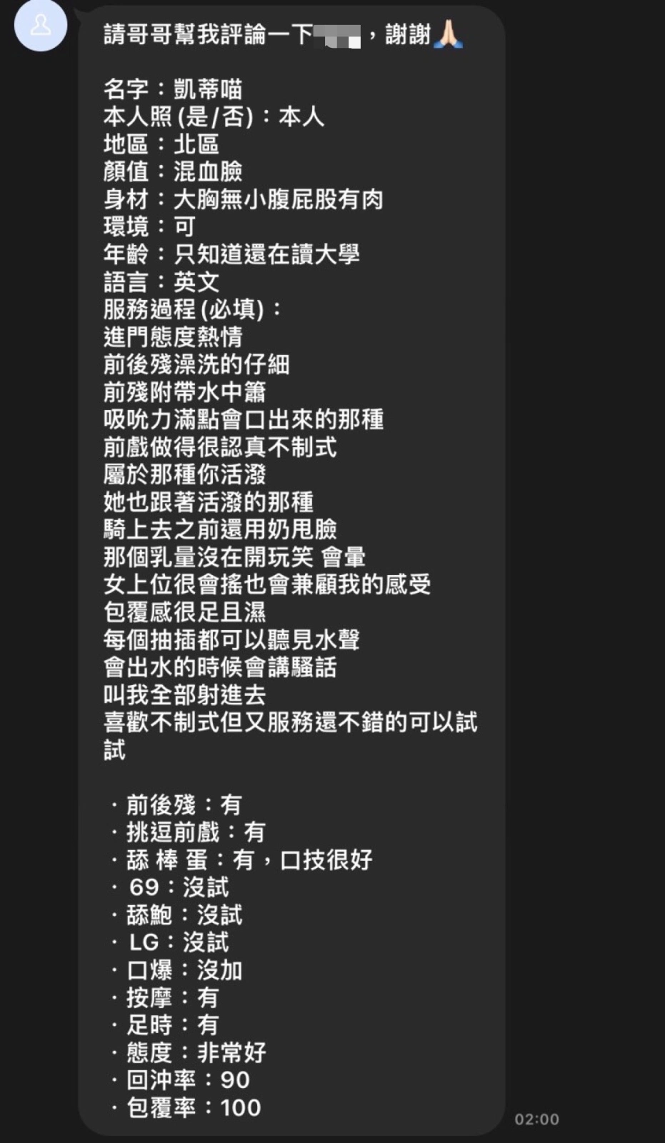 奶砲,按摩,69,共浴,LG(舌吻)依氣氛衛生而定,可親嘴,無套吹,潮吹(依貴賓技術而定),品鮑,舔蛋,奶推,屁推,變裝(自備免付),絲襪(自備免付),玩具(按摩棒),玩具(跳蛋),情趣用品(客自備),白人,中文溝通,英文溝通,快餐,2S,NS,包夜