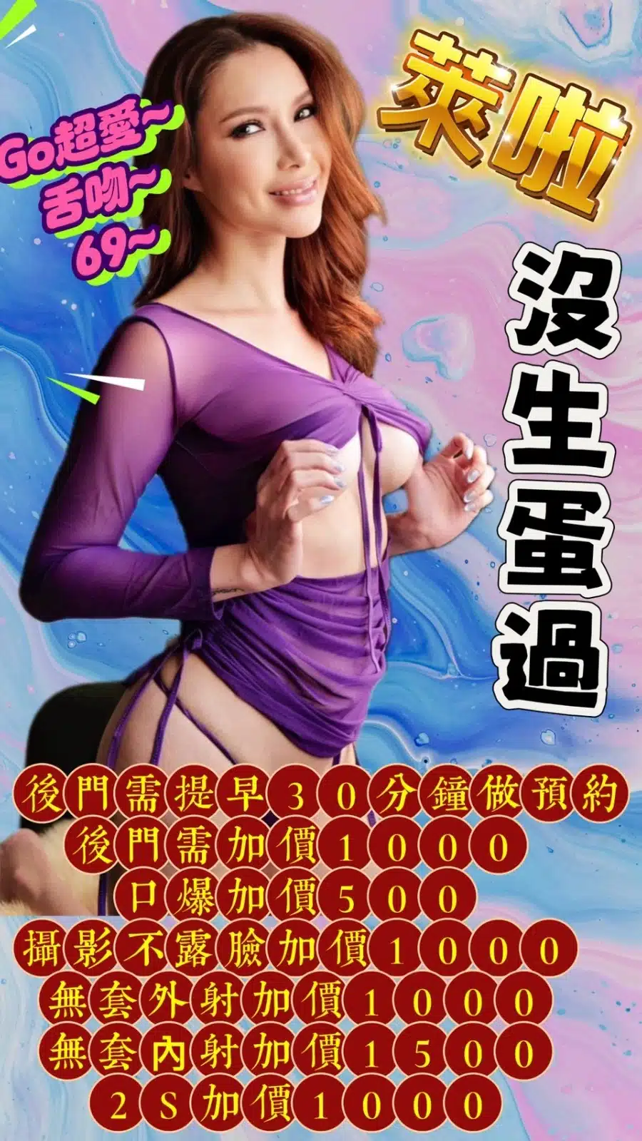 2S+1000(60分),後門+1000,情趣用品+500(客自備),口爆+500,攝影+1000(不露臉),無套外射+1000,無套內射+1500