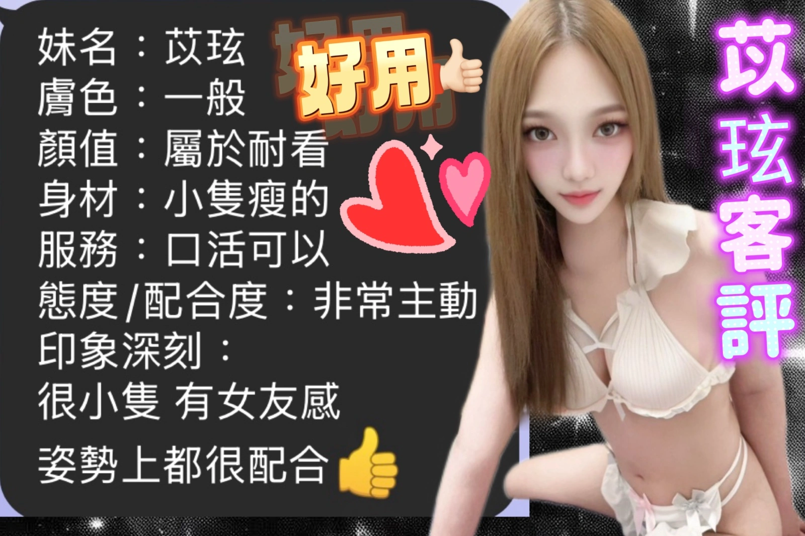 奶砲,按摩,69,共浴,可親嘴,無套吹,品鮑,舔蛋,奶推,屁推,艷舞秀,無套做,無套內射,自慰秀,快餐,2S,包夜