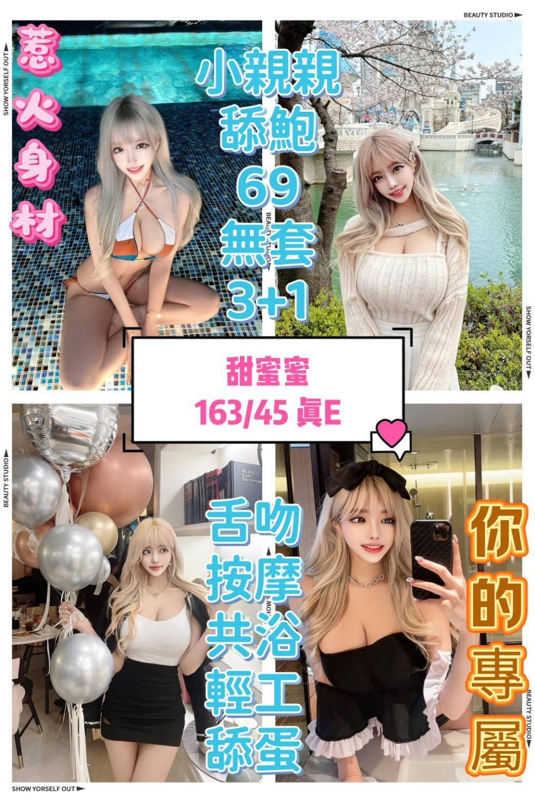 按摩,69,共浴,殘廢澡,LG(舌吻)依氣氛衛生而定,可親嘴,無套吹,品鮑,舔蛋,輕功,無套做,無套內射,中文溝通,快餐,2S