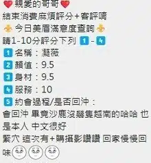 按摩,69,共浴,可親嘴,無套吹,口爆,品鮑,舔蛋,顏射,變裝(自備免付),絲襪(自備免付),玩具(按摩棒),玩具(跳蛋),情趣用品(客自備),攝影,中文溝通,快餐,2S