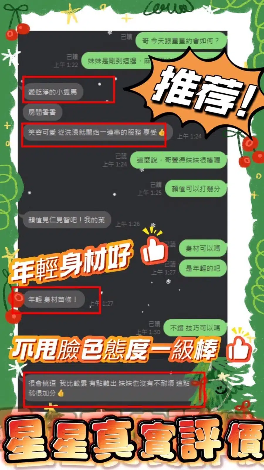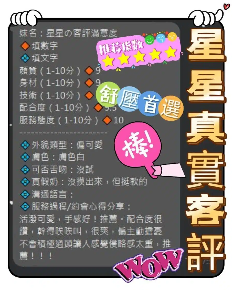奶砲,毒龍,按摩,69,共浴,LG(舌吻)依氣氛衛生而定,可親嘴,無套吹,口爆,品鮑,舔蛋,奶推,屁推,顏射,浴中蕭,絲襪(自備免付),玩具(按摩棒),玩具(跳蛋),情趣用品(客自備),快餐,2S