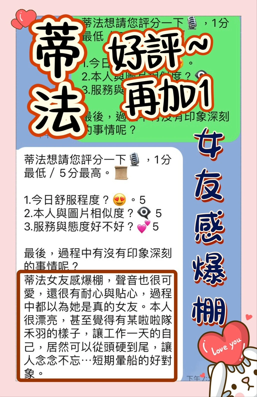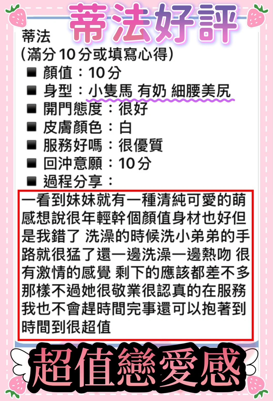 奶砲,按摩,69,共浴,殘廢澡,LG(舌吻)依氣氛衛生而定,可親嘴,無套吹,品鮑,舔蛋,輕功,變裝(自備免付),絲襪(自備免付),快餐,2S
