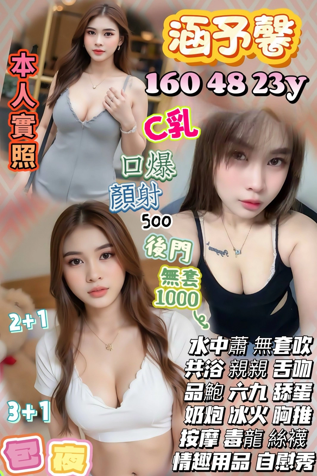 2S+500(60分),口爆+500,顏射+500,後門+1000,無套外射+1000