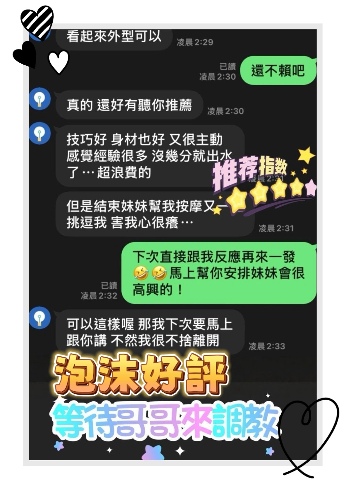 2S+500(60分鐘) 口爆+500 顏射+500 口爆吞精+1000 無套內射+1000