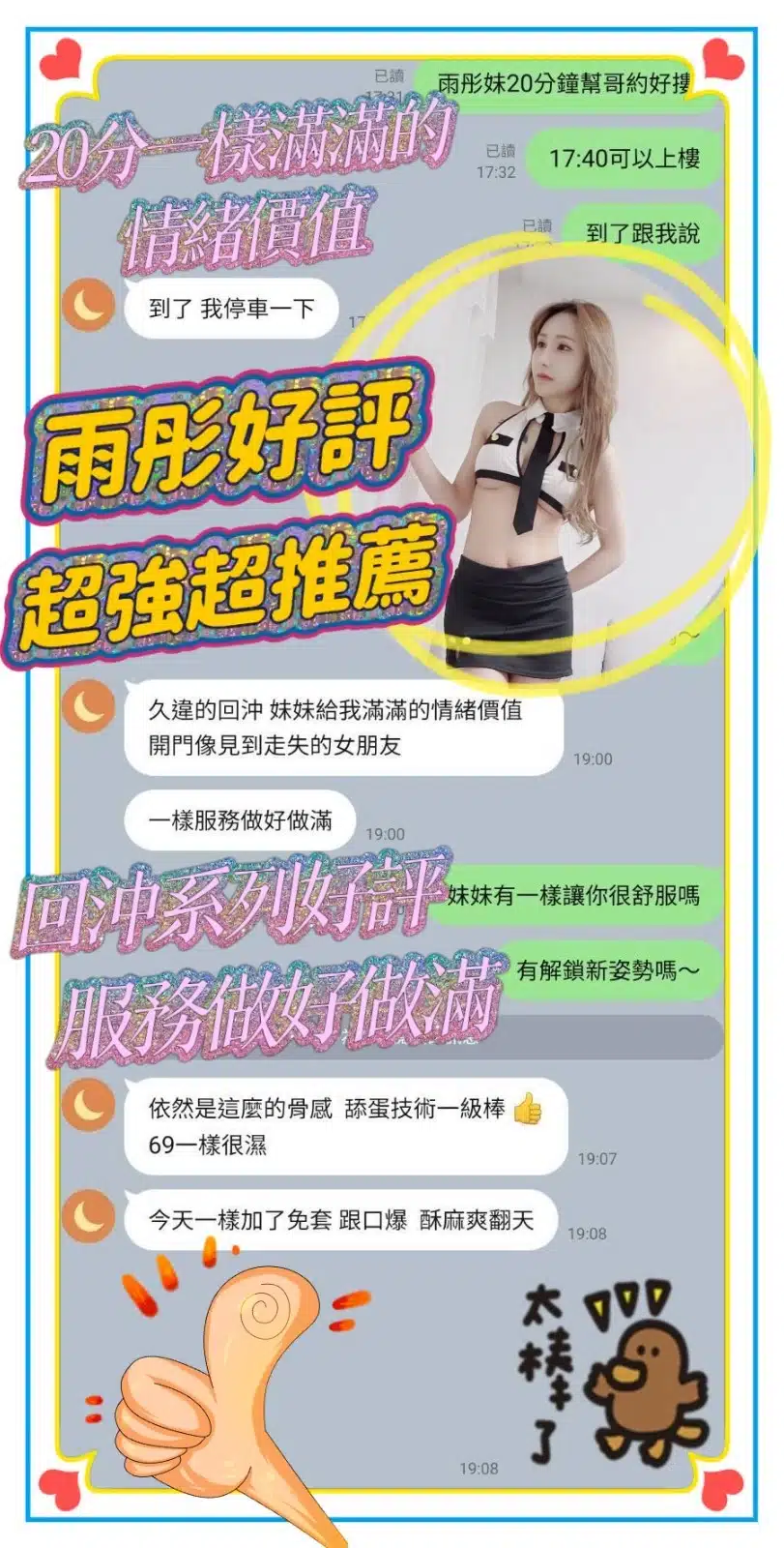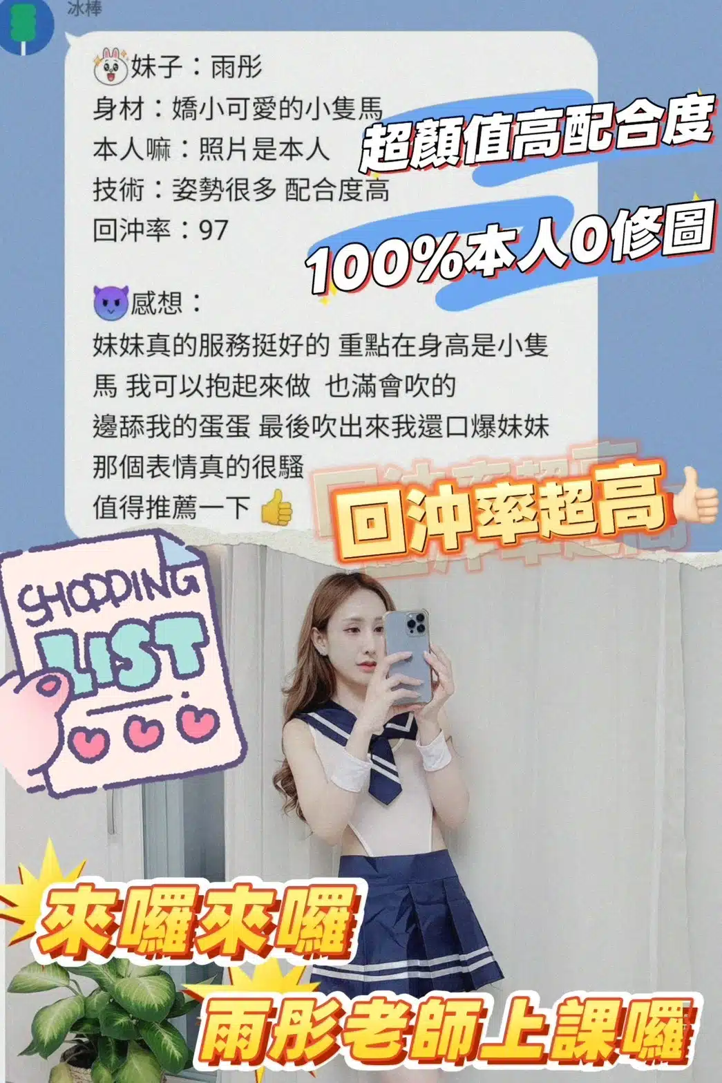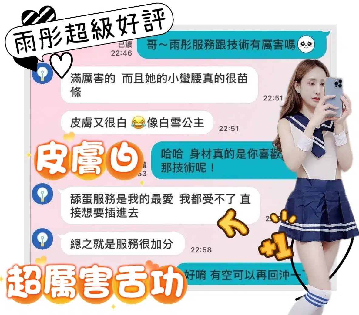 奶砲,69,共浴,LG(舌吻)依氣氛衛生而定,可親嘴,無套吹,口爆,品鮑,舔蛋,奶推,冰火,深喉嚨,變裝(自備免付),絲襪(自備免付),無套做,無套內射,快餐,2S