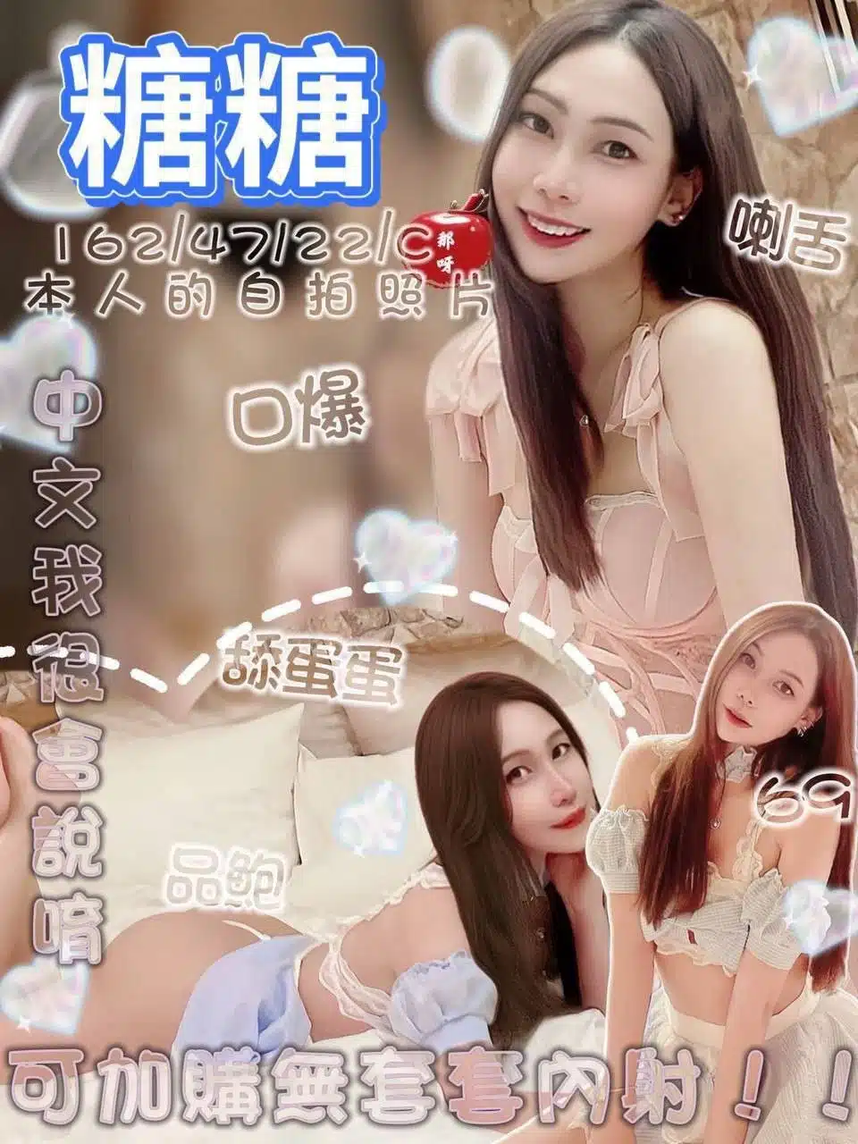 奶砲,按摩,桑拿,共浴,可親嘴,無套吹,口爆,輕功,冰火,深喉嚨,變裝(自備免付),絲襪(自備免付),無套做,自慰秀,攝影,快餐,2S