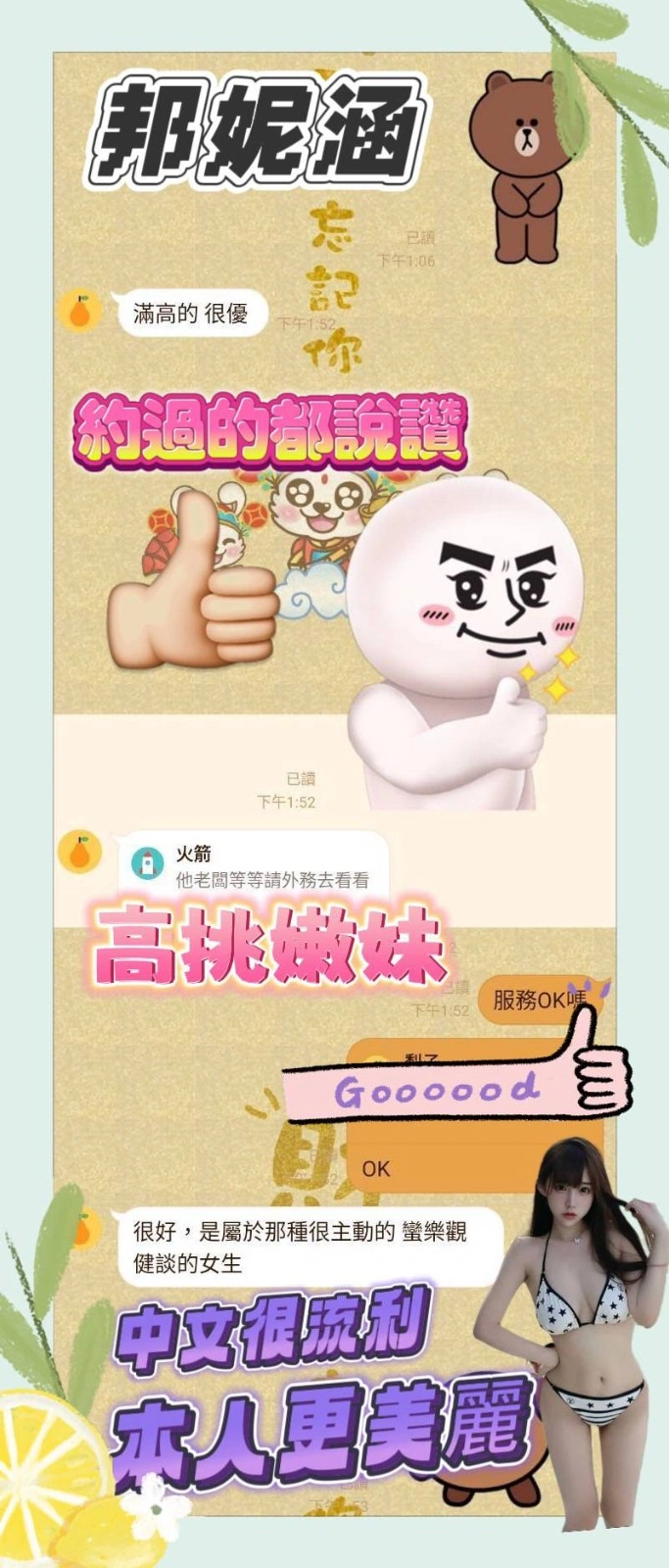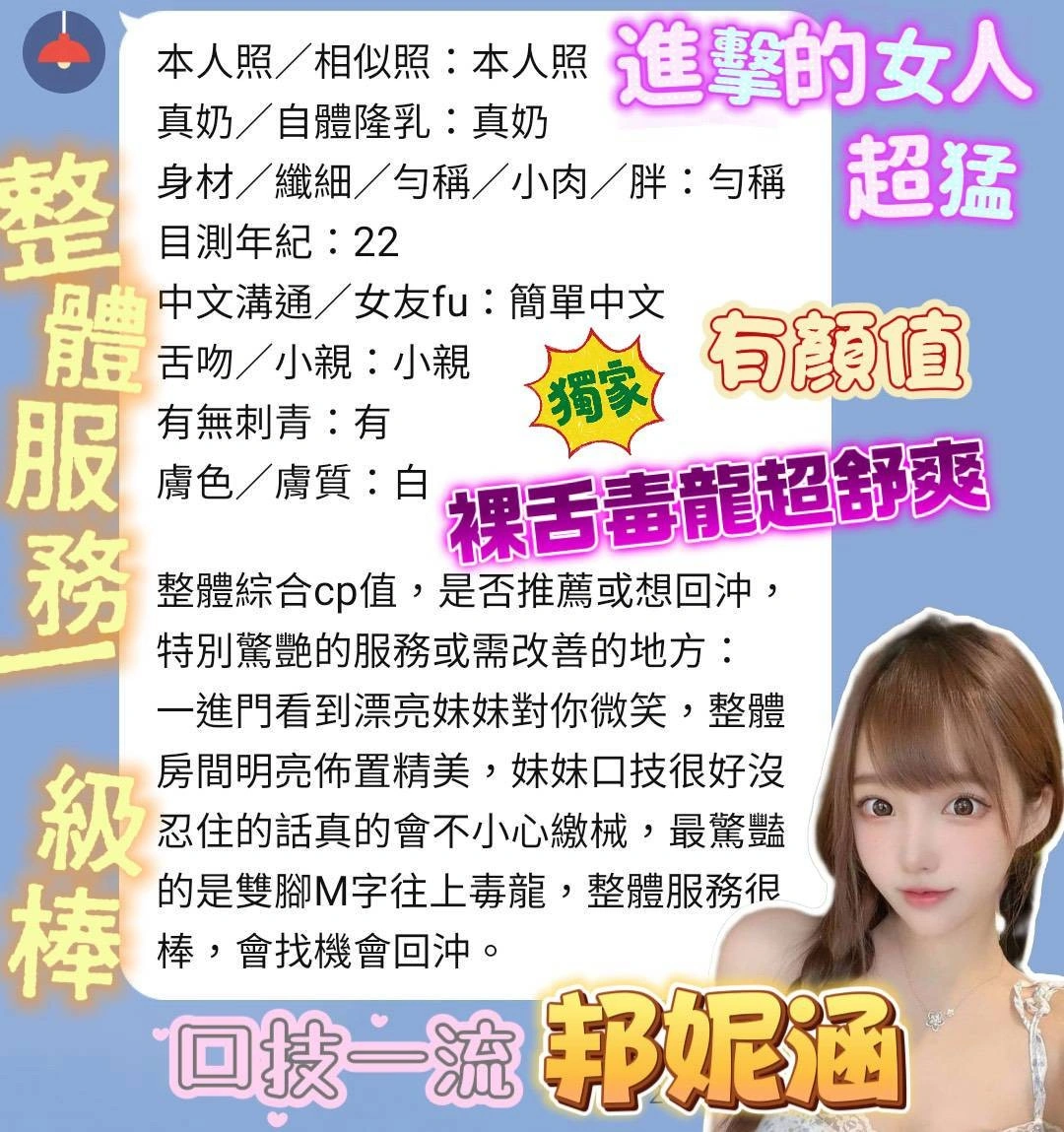 奶砲,按摩,69,陪洗,共浴,LG(舌吻)依氣氛衛生而定,可親嘴,無套吹,口爆,品鮑,舔蛋,自慰秀,快餐,2S,射後清槍