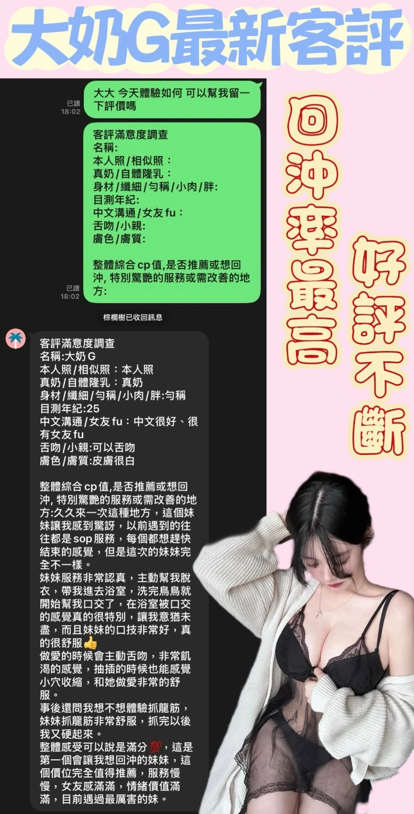 奶砲,按摩,69,共浴,LG(舌吻)依氣氛衛生而定,可親嘴,無套吹,口爆,足交,品鮑,舔蛋,顏射,艷舞秀,變裝,自慰秀,攝影,中文溝通,快餐,2S