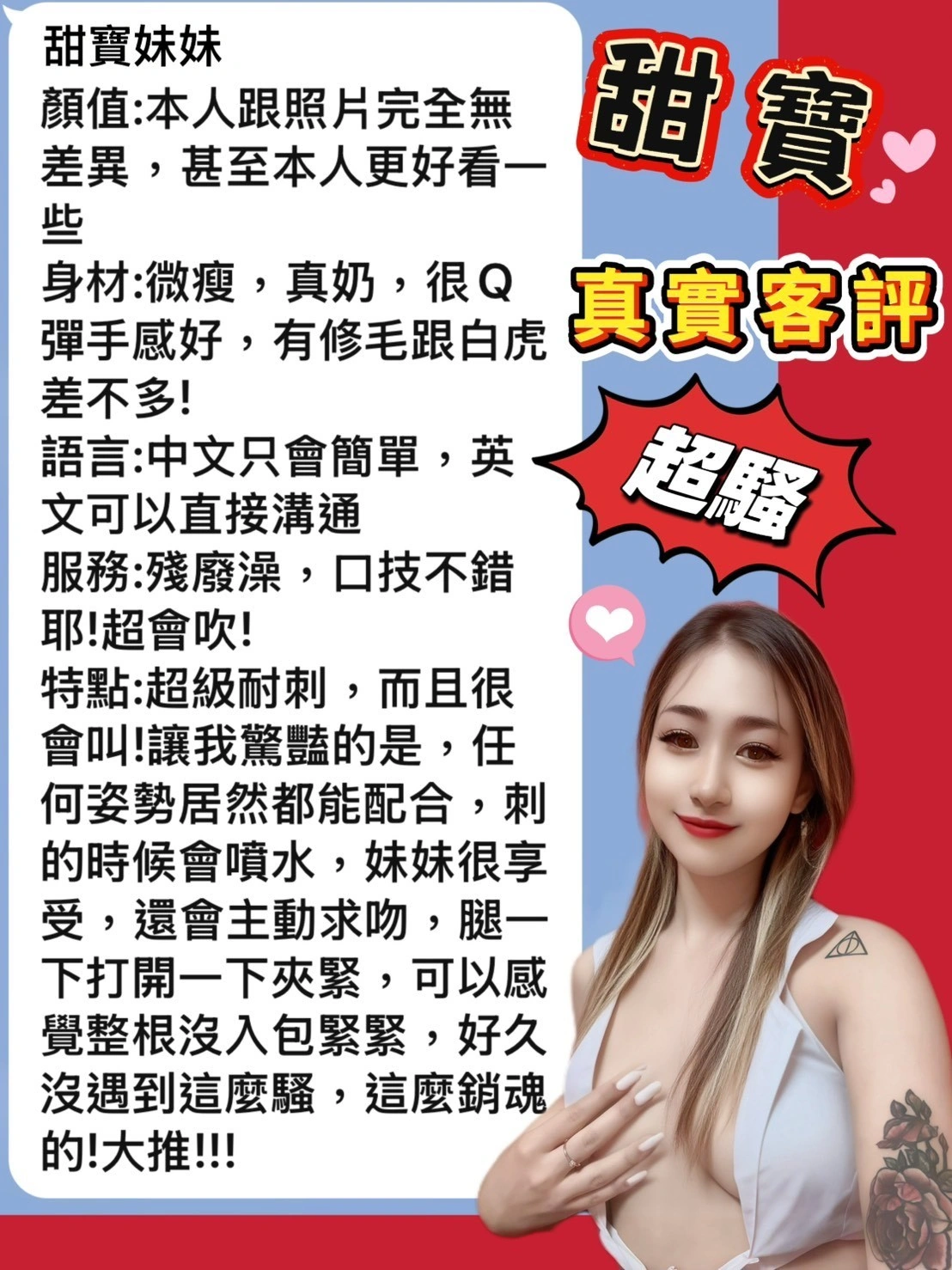 按摩,69,共浴,可親嘴,無套吹,品鮑,舔蛋,絲襪(自備免付),快餐,2S