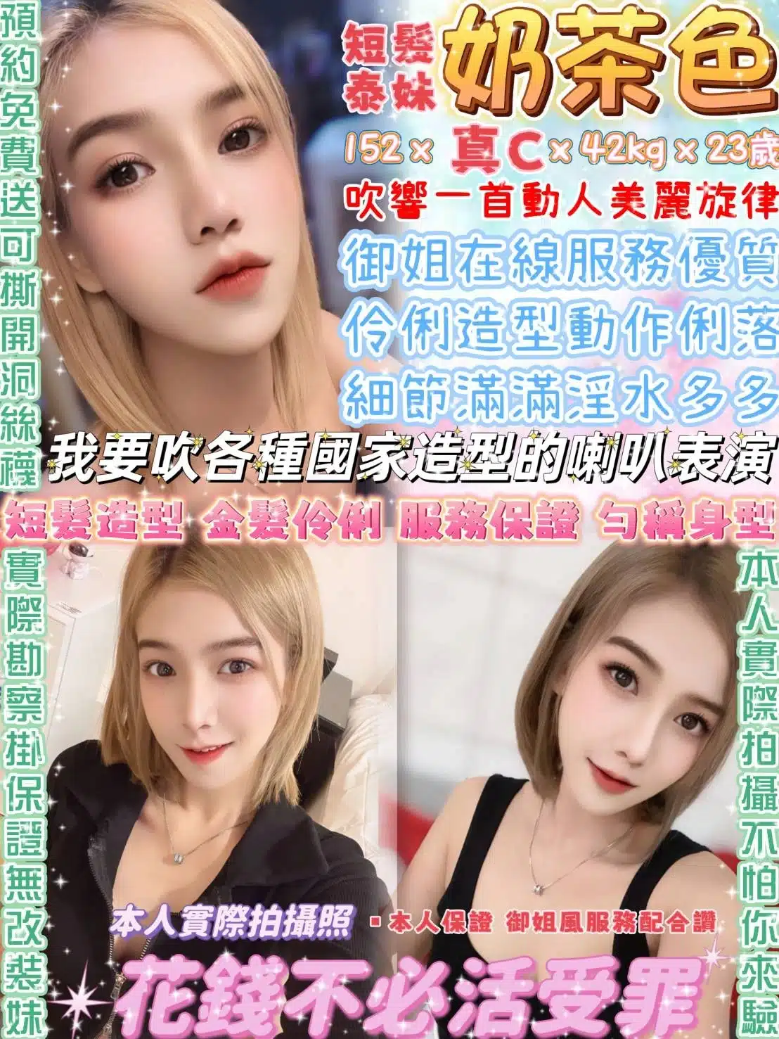 奶砲,按摩,69,共浴,LG(舌吻)依氣氛衛生而定,可親嘴,無套吹,品鮑,舔蛋,奶推,屁推,顏射,絲襪,英文溝通,快餐,2S