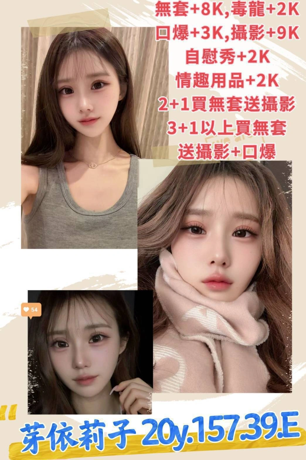 無套外射+8000,攝影+9000,情趣用品+2000,毒龍+2000,口爆+3000,自慰秀+2000,車資依地區計價