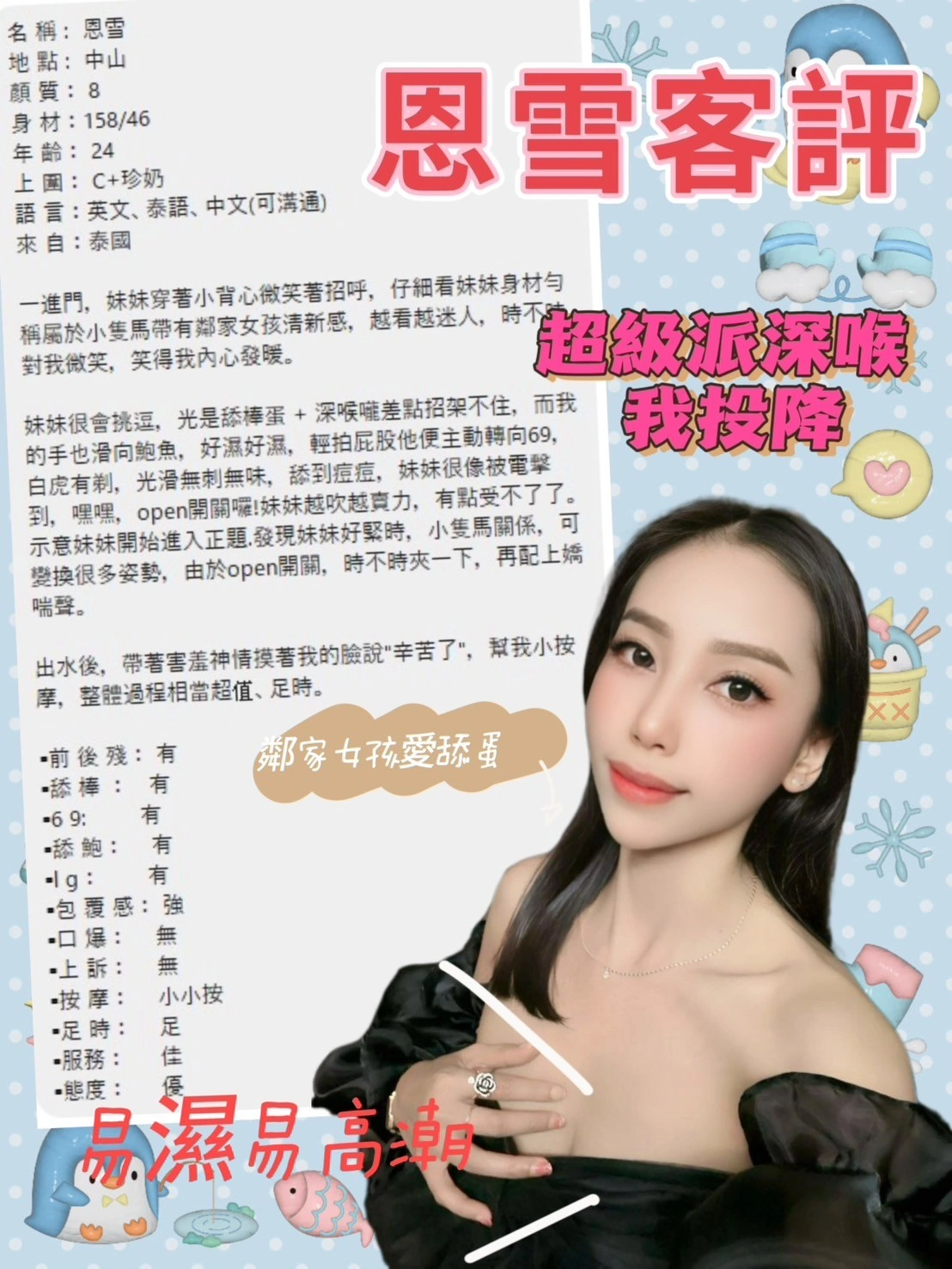 奶砲,毒龍,按摩,69,殘廢澡,LG(舌吻)依氣氛衛生而定,可親嘴,無套吹,口爆,吞精,品鮑,舔蛋,過水,漫遊,奶推,屁推,冰火,浴中蕭,深喉嚨,艷舞秀,絲襪(自備免付),玩具(按摩棒),玩具(跳蛋),情趣用品(客自備),無套做,無套內射,後門,自慰秀,中文溝通,英文溝通,快餐,2S,包夜