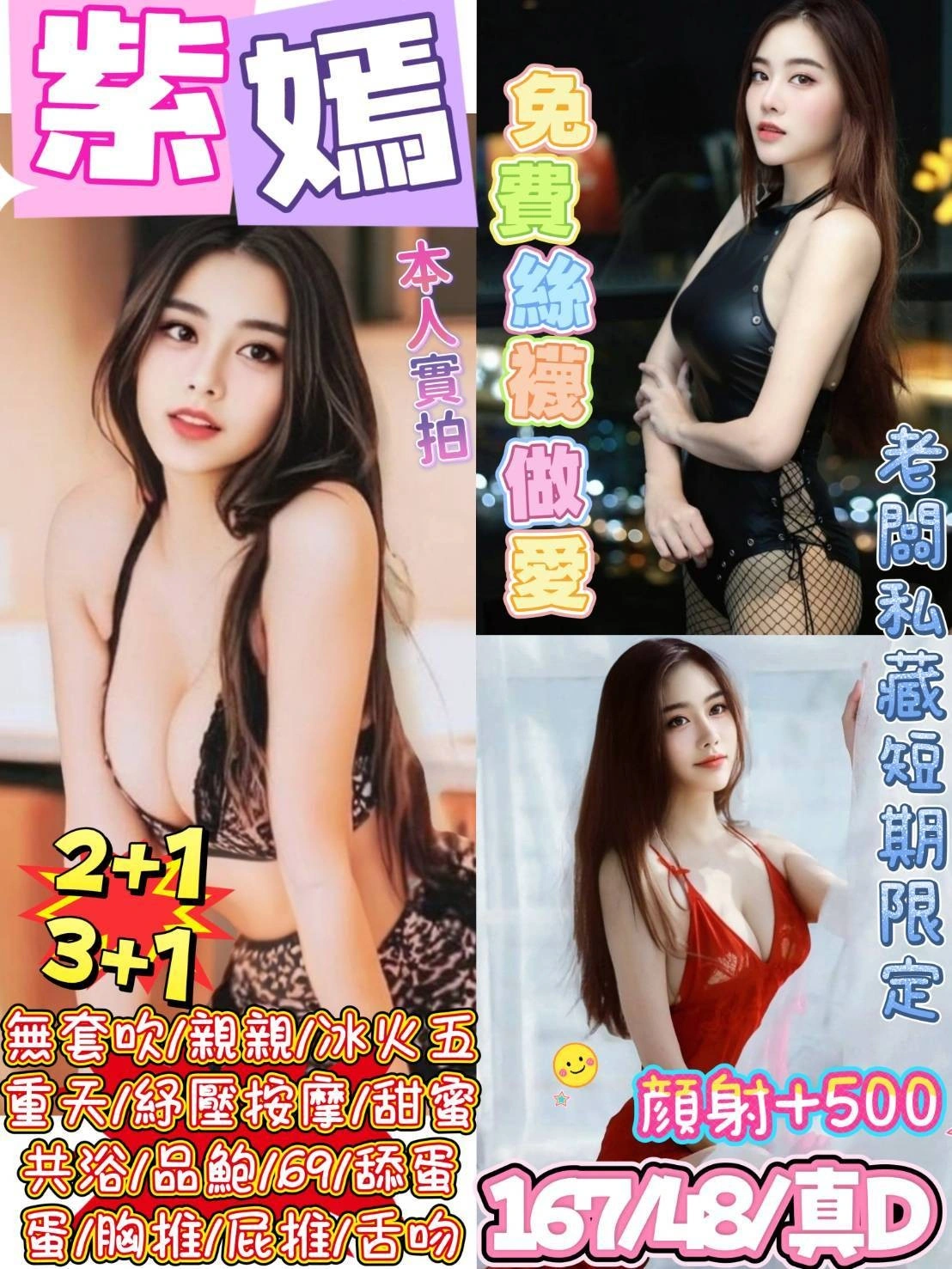 按摩,69,共浴,LG(舌吻)依氣氛衛生而定,可親嘴,無套吹,品鮑,舔蛋,奶推,屁推,冰火,顏射,變裝(自備免付),絲襪,快餐,2S