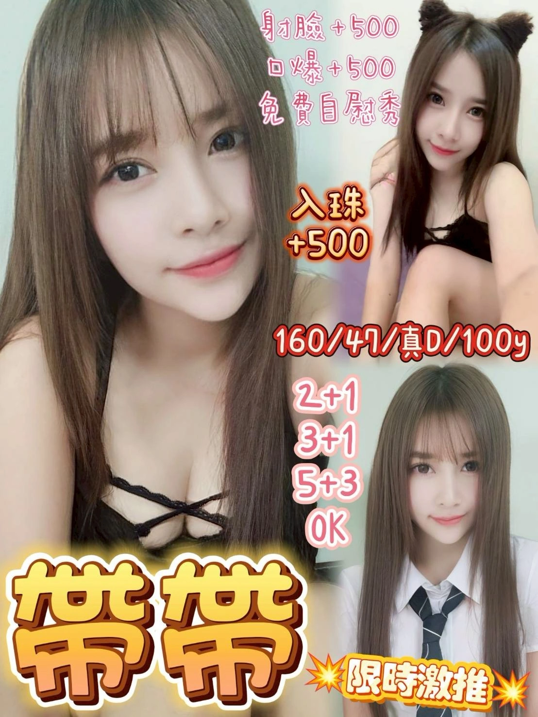 2S+500(60分),口爆+500,顏射+500,入珠+500,無套內射(私議),絲襪+100,0.01套+100