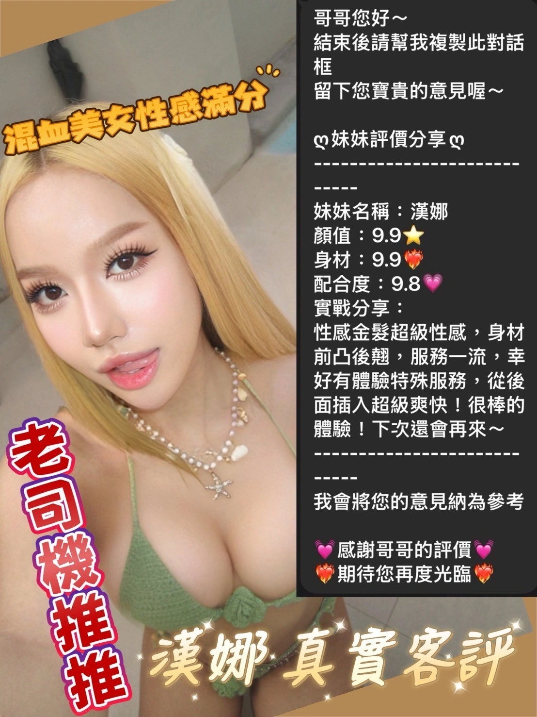 奶砲,按摩,69,殘廢澡,LG(舌吻)依氣氛衛生而定,可親嘴,無套吹,口爆,品鮑,舔蛋,奶推,屁推,深喉嚨,絲襪(自備免付),後門,快餐,2S