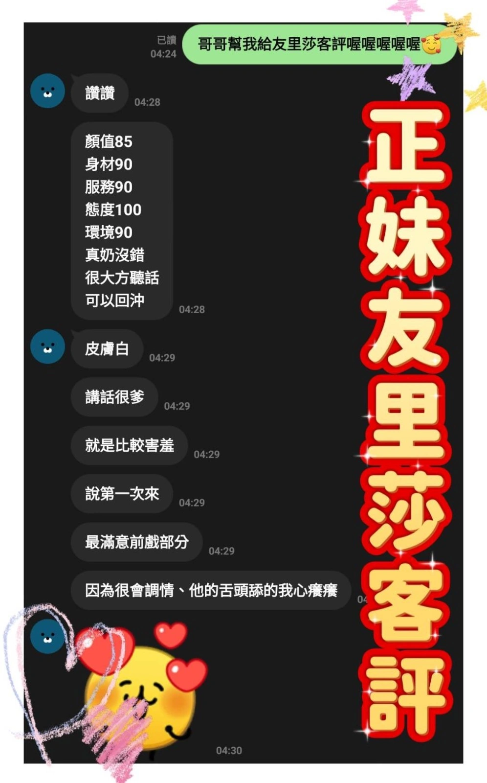 奶砲,按摩,69,殘廢澡,LG(舌吻)依氣氛衛生而定,可親嘴,無套吹,口爆,品鮑,舔蛋,奶推,屁推,顏射,深喉嚨,絲襪(自備免付),無套做,無套內射,後門,快餐,2S