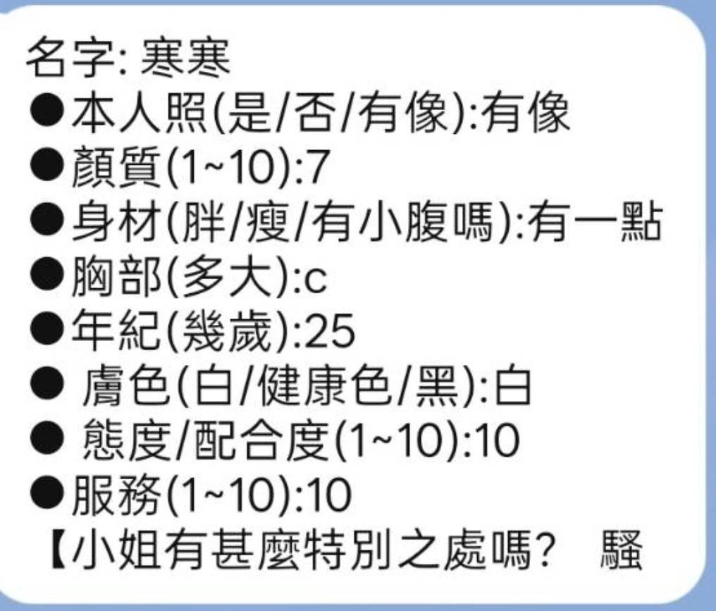 口爆+2000,清槍+2000,顏射+2000,吞精+2000,野戰+3000,無套內射+3000,車資依地區計價