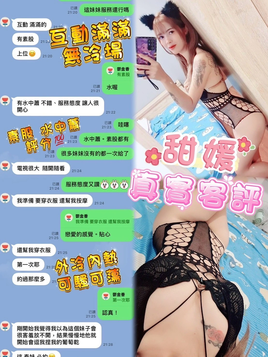 奶砲,按摩,69,LG(舌吻)依氣氛衛生而定,可親嘴,無套吹,口爆,品鮑,舔蛋,奶推,顏射,浴中蕭,深喉嚨,變裝,絲襪,玩具(按摩棒),玩具(跳蛋),無套做,自慰秀,攝影,快餐,2S,NS,包夜,射後清槍