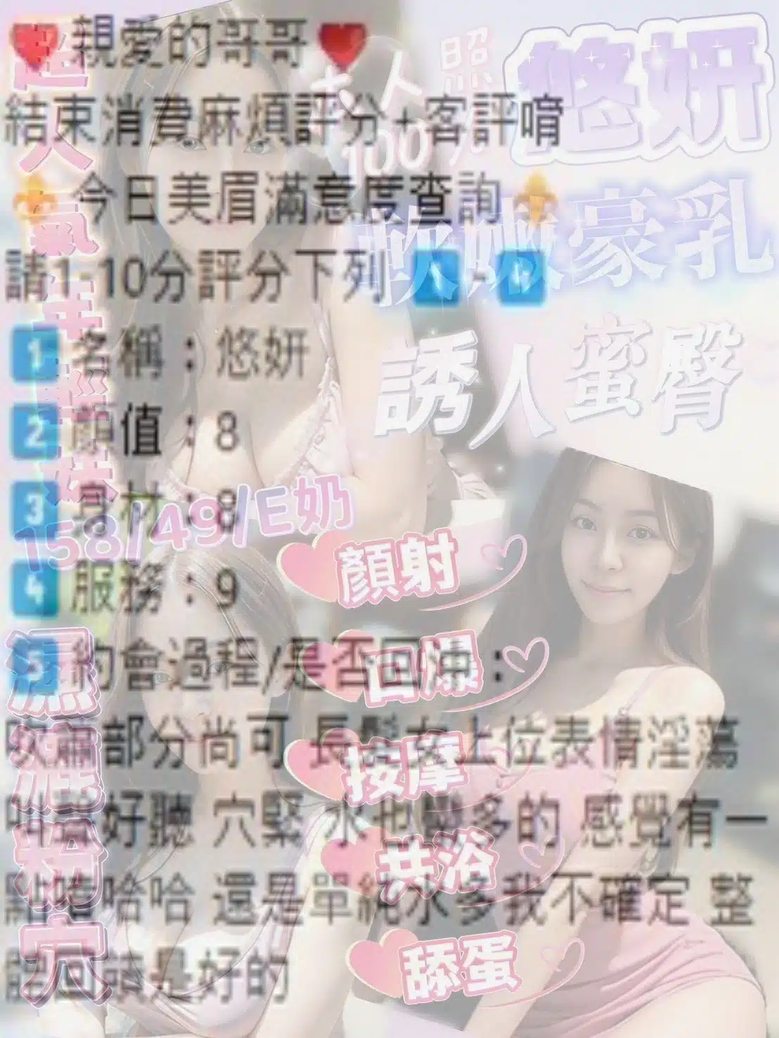 按摩,69,共浴,LG(舌吻)依氣氛衛生而定,可親嘴,無套吹,口爆,品鮑,舔蛋,顏射,變裝(自備免付),絲襪(自備免付),快餐,2S