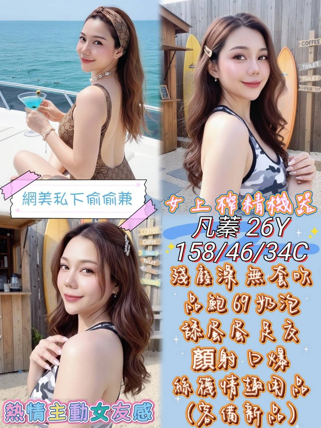 按摩,69,共浴,LG(舌吻)依氣氛衛生而定,可親嘴,無套吹,口爆,品鮑,舔蛋,輕功,奶推,顏射,絲襪(自備免付),玩具(按摩棒),玩具(跳蛋),情趣用品(客自備),快餐,2S